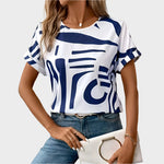 Elegantna majica z modernim abstraktnim vzorcem v modrih in belih odtenkih. Idealni kos za vsakodnevne kombinacije, ki izstopajo.