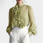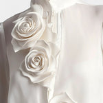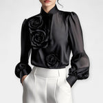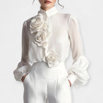 Ta bela majica z impresivnimi 3D aplikacijami v obliki vrtnic nadgradi tvoj stil z noto romantike in luksuza. Visok ovratnik in diskretno prosojna tkanina zagotavljata zračno, izpopolnjeno silhueto, idealno za kombinacijo s krojenimi hlačami ali krili.