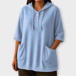 Eleganten in udoben pulover, ki se prilega vsakemu slogu, dodaja rafinirano noto vsakemu videzu. Njegova prilagodljiva zasnova s kapuco in gumbi ga naredi idealno izbiro za vse priložnosti, od sproščenih do bolj elegantnih. Kosi, ki združuje praktičnost in brezčasno eleganco, nudi udobje in enostavno nošenje.