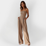 Ta črn brez naramnic kombinezon je epitom elegance in ženskosti. Časovno preizkušena izbira za vsak večerni videz ali uradno priložnost.