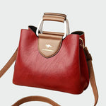Sofisticirana ročna torba v črno-rjavi dvobarvni kombinaciji, ki združuje luksuz in praktičnost. Kovinske ročice s podlogo ponujajo edinstven karakter in stabilen oprijem, medtem ko dolg odstranljiv trak omogoča nošenje čez telo. Prostorna notranjost nudi dovolj prostora za vsakodnevne potrebščine, kar jo dela idealno za poslovne in elegantne nastope.