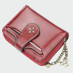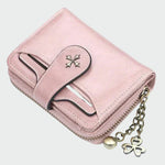 Sodobna denarnica v črni barvi, z elegantnim oblikovanjem in praktičnimi podrobnostmi. Ima pokrov s sponko in kovinsko dekoracijo, prav tako pa zadrgo z verigo in očarljiv obesek. Njena kompaktna velikost jo naredi idealno za vsakodnevno uporabo, hkrati pa nudi dovolj prostora za kartice, kovance in bankovce.