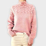 Ženski pulover z pletenjem združuje brezčasno eleganco z maksimalnim udobjem. Struktura pletenja ga naredi resnično impresivnega – idealen za vsakodnevno nošenje, pisarno ali sproščene trenutke. Udoben visok ovratnik in dolgimi rokavi zagotavljajo prijetno toploto, medtem ko ohlapen kroj omogoča svobodo gibanja.