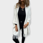 Eleganten plašč, ki se prilagaja vsakemu slogu in daje popoln končni pečat vsakemu videzu. Njegova vsestranska zasnova z diskretnimi resicami ga dela idealnega za vse priložnosti, od vsakodnevnih do bolj formalnih. Kos, ki združuje praktičnost in brezčasno eleganco, prinaša toplino in udobje.