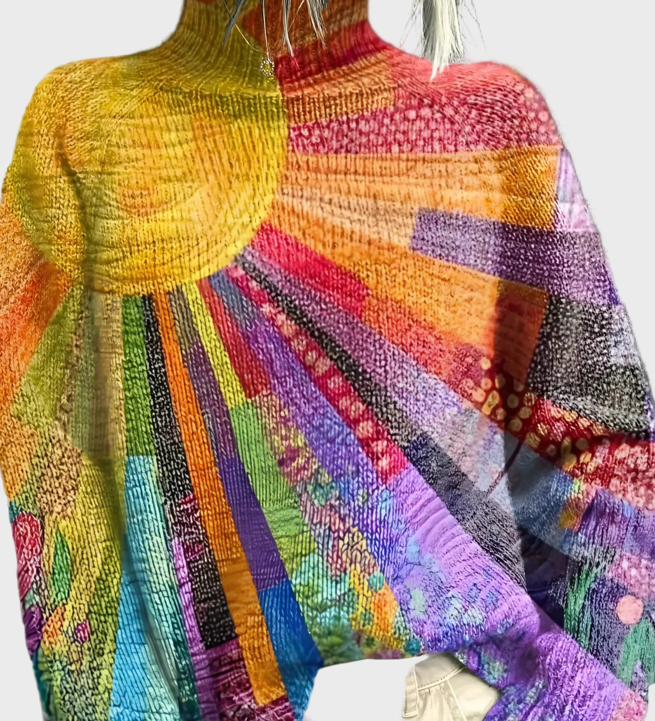 Pleteni pulover z visokim ovratnikom z živahnim vzorcem