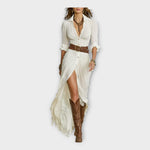 Izpopolnjena obleka, ki naravno in brez napora poudarja ženskost. Njena prilagodljiva zasnova prinaša harmonijo med udobjem in eleganco, kar ponuja kos, ki ga lahko nosite ob vsaki priložnosti. Njena lahkotna linija omogoča svobodo gibanja, medtem ko se prileganje enostavno prilagaja različnim stilom, od sproščenih do bolj posebnih videzov. Oblačilo, ki združuje praktičnost, brezčasni značaj in stil, ki izstopa.
