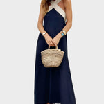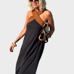 Ta brezrokavna obleka z edinstvenim dizajnom na dekolteju je popolna izbira za vroče dni in elegantne nastope. Kombinacija naravnih odtenkov in prečnega ovratnika poudarja ženskost s preprostostjo in stilom.