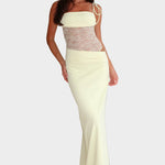 Odkrijte svojo ženskost in eleganco s to dolgo obleko v nežni pastelno rumeni odtenek. Kombinacija fine čipke na dekolteju in oprijetega spodnjega dela ustvarja izjemno privlačen in izpopolnjen videz, idealen za večerne izhode ali posebne priložnosti.