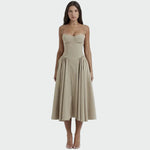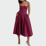 Impozantna in brezčasna obleka, ki objame silhueto in prinaša neustavljivo eleganco. Prilegajoč top z tankimi naramnicami poudarja ženskost, medtem ko zračna krila nudijo udobje in gibljivost. Idealna za večerne izhode, elegantne dogodke in posebne trenutke.