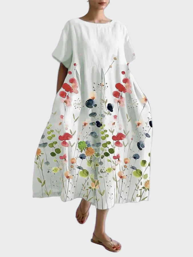 Akvarelna Livada je obleka, ki izžareva romantiko in naravno eleganco. Z belim ozadjem in cvetličnim vzorcem v akvarelnem slogu je idealna izbira za vaše pomladne in poletne nastope.