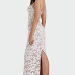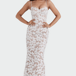 Izpopolnjena maksi obleka s čipko v cvetličnem vzorcu, ki s svojo eleganco in brezčasnim stilom poudarja ženskost. Tanek trak in oprijet kroj harmonično objemata silhueto, kar jo naredi idealno za večerne izhode ali posebne priložnosti. Prosojna tekstura čipke prinaša občutek razkošja in romantike.