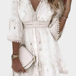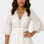 Objemite brezčasno eleganco s to čudovito zasnovano mini obleko z čipko. Ima tanko vezeno čipko, ženstven V-izrez in široke rokave – idealna za posebne priložnosti, poletne zmenke ali poročne nastope.