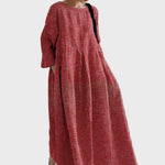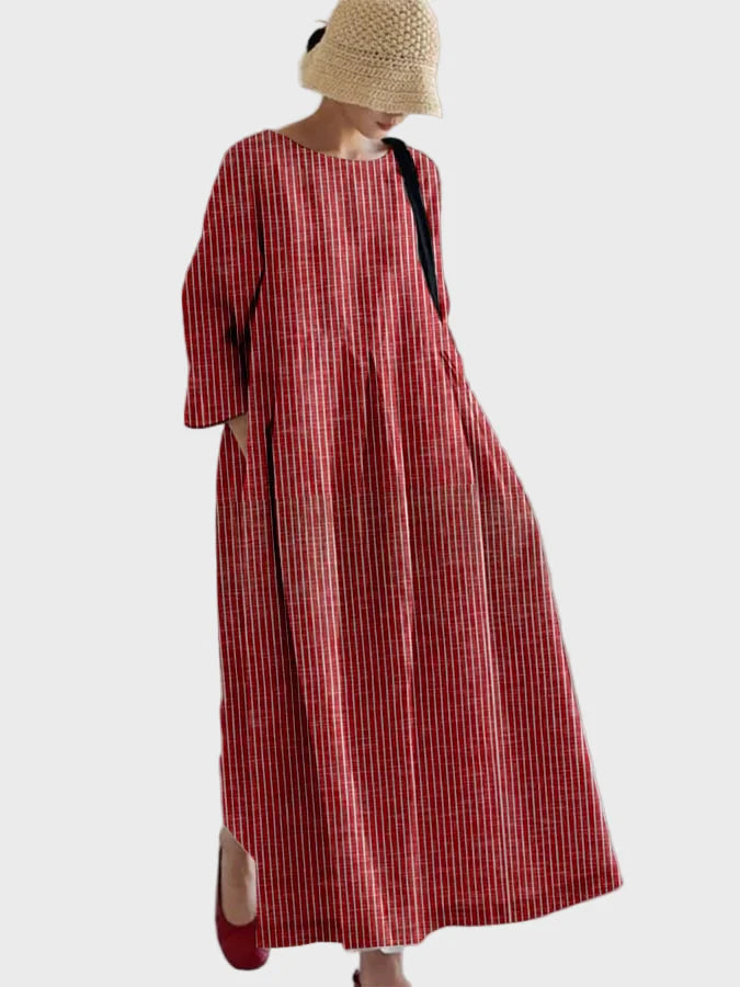 Ustvarite občutek brezčasne elegance s to dolgo rdečo obleko z navpičnimi belimi črtami. Ohlapen kroj in tri četrt miganja nudita udobje, medtem ko dolžina zagotavlja izpopolnjen in zračen videz. Idealna je za vsakodnevne, pa tudi bolj elegantne priložnosti.