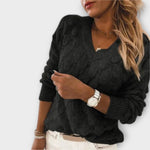 Pulover Noemier za ženske z V-izrezom združuje brezskrbno eleganco in brezčasno udobje. S svojimi laskavimi V-izrezom in sproščenim krojem ta pulover ponuja popolno kombinacijo sloga in udobja. Ne glede na to, ali gre za vsakodnevno nošenje, pisarno ali sproščene vikend izlete – Noemier je vedno prava izbira.