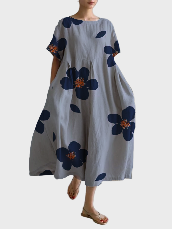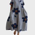 Obleka Grey Blossom Flow združuje minimalistični sivi ton z osupljivimi mornarsko modrimi cvetovi, ki dodajajo živahnost in stil. Z ohlapno silhueto in lahkim materialom je idealna izbira za udobje in eleganco ob vsaki priložnosti.