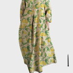 Prinesite svežino poletja v svoj videz s tem midi oblačilom v bež osnovi, okrašenim z osupljivimi rumenimi limonami in zelenimi listi. Ohlapen kroj in tri četrt miganja zagotavljata udobje in praktičnost, medtem ko dizajn prinaša živahen in mediteranski občutek.